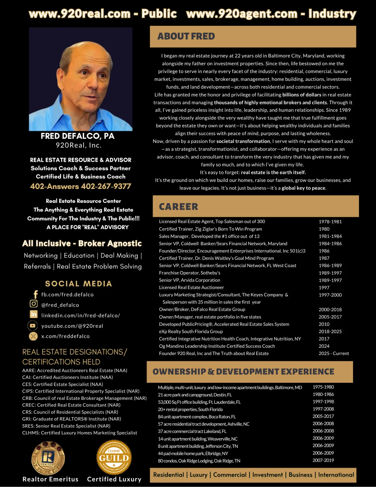 With over 50 years of experience and billions in transactions, Fred DeFalco is a trusted leader in real estate strategy, brokerage, and high-stakes negotiations. His career spans every sector of the industry—residential, commercial, luxury, development, auctions, and investment advisory—helping clients achieve exceptional results in any market condition.